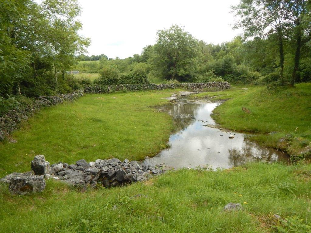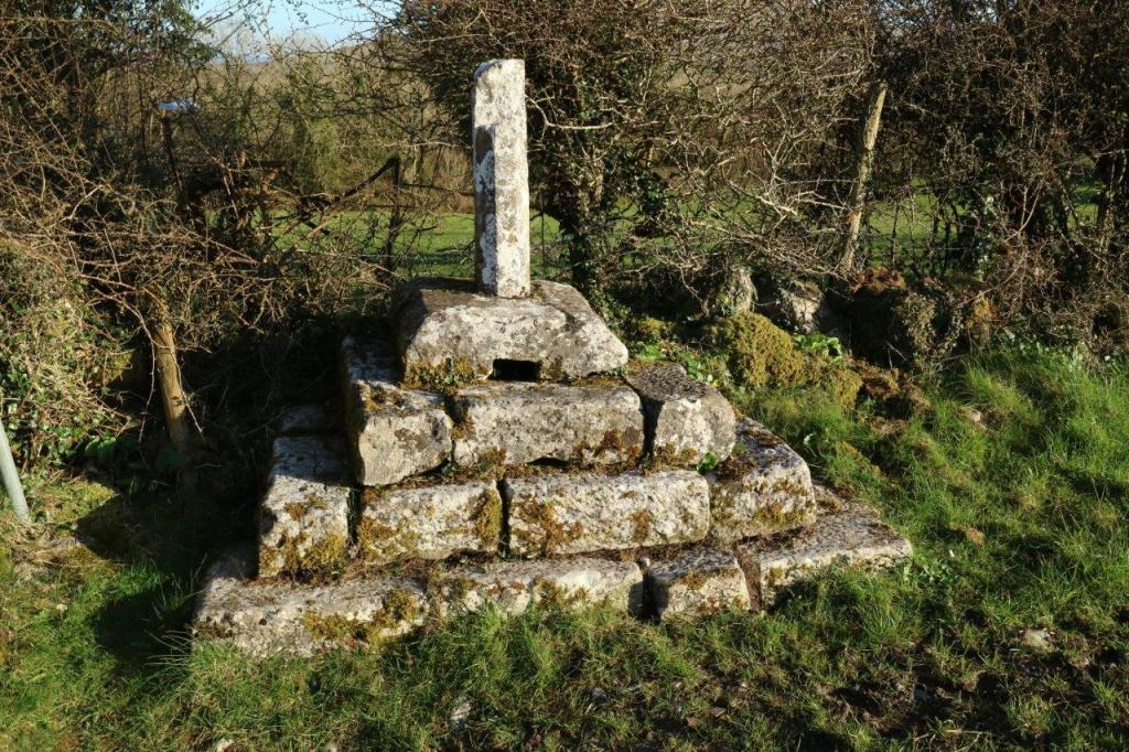 The well is situated at the end of a short lane on the left hand side of the road proceeding from the townland of Glencolmcille in the direction of Kinvara. The lane is prone to flooding. In living memory, if the lane were flooded on the saint’s feast day 9th June, wooden planks were laid down in order to ensure access to the well. The ensemble of water, dry stone well house and cross fragment are known locally as “the oratory”.